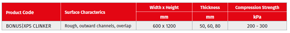 Bonus XPS Clinker is the thermal insulation board that used under the clinker brick. It has a rough surface, outward channels, overlapping edges, 30mm-clinker brick. It has a rough surface, outward channels, overlapping edges, 30mm-50mm thickness and a size of 600mm x 1250mm.