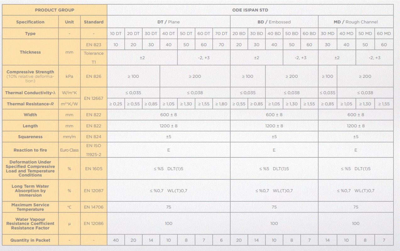 - ODE Isıpan is manufactured in the λ = 0.035-0.038 W/ (m.K) thermal conductivity range in accordance with the EN 131642 standard.