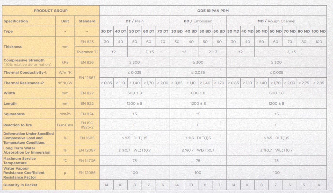 ODE ISIPAN DT PRM 300 has a thermal conductivity of 0.35 W(m.K), a compressive strength of 300 kPa, and an optimum water vapor diffusion resistance factor which is analogous with a waterproof structure.