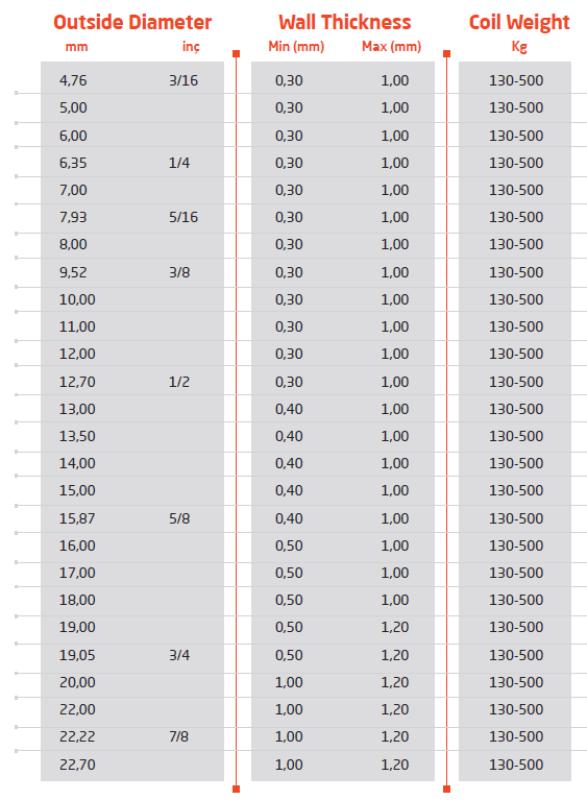 UCI copper tube production is carried out with diameters ranging from 4.76 to 22.70 mm and wall thicknesses between 0.30 to 1.20 mm, in annealed and hard tempers.